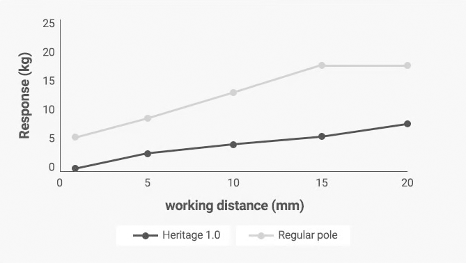Heritage 1.0は1.3ポンド(約590g)というわずかな衝撃も即座に検知し、反応しました。一般的なアンチショックポールと比較し圧倒的に軽い衝撃にも反応します。