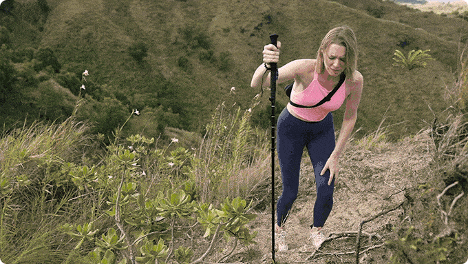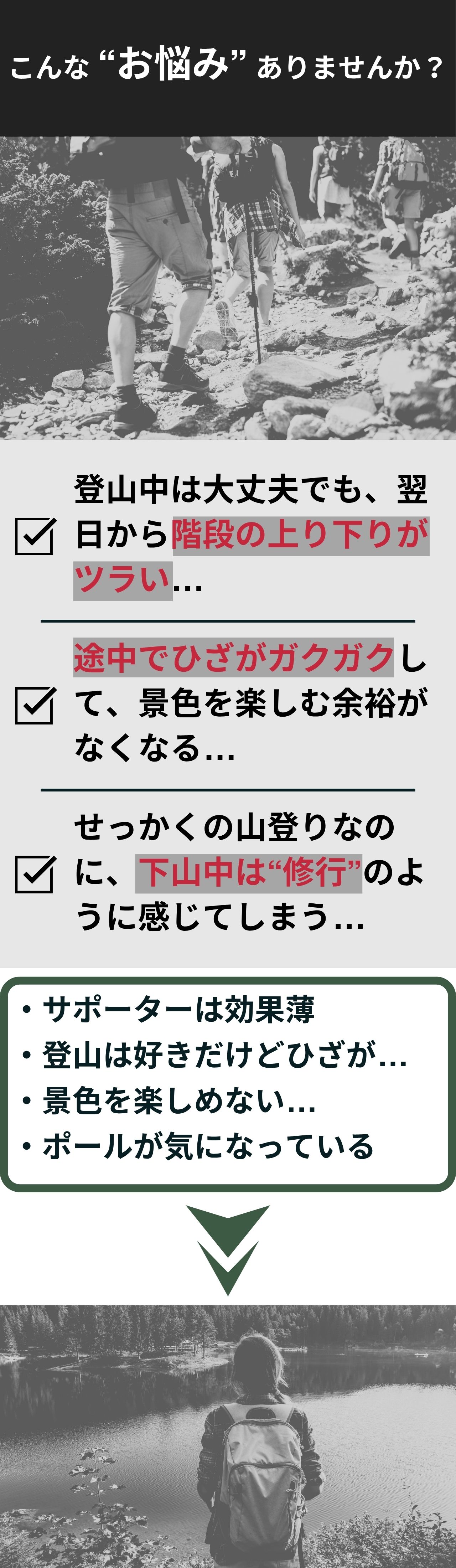 登山が大好き。だけど、下山のたびに足がガクガク。 途中からひざに不安が出てくると、せっかくの絶景も楽しめなくなる。 「もっとラクに、もっと快適に登れたら…」そんな声から、この商品は生まれました。